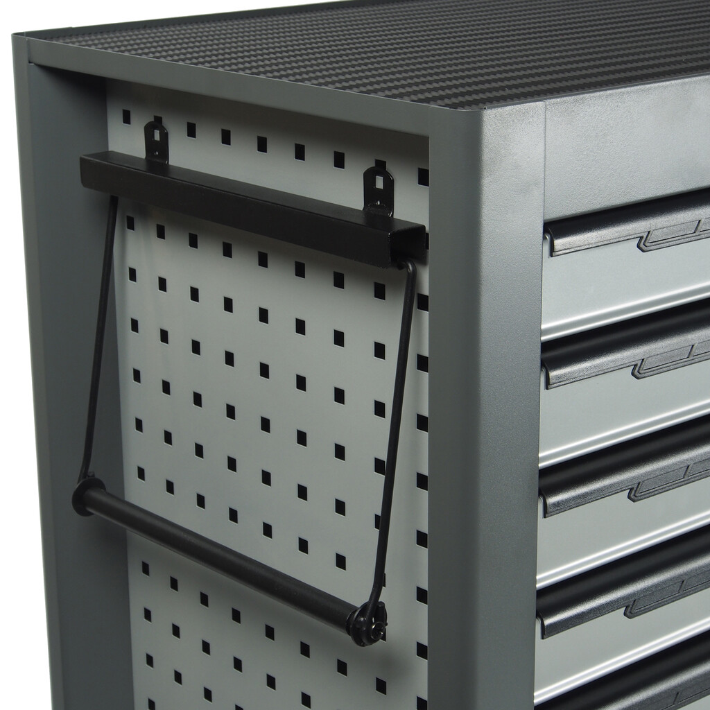 Перфорированные внутренние стенки боковых ящиков с квадратными отверстиями предоставляют возможность разместить дополнительные аксессуары для хранения инструментов. Применяется с серией подвесных приспособлений JTC-3218.