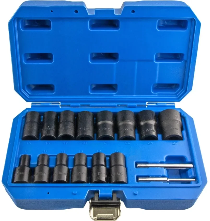 - Набор включает головки размером 8-27мм., под привод 1/2 дюйма и 2 выколотки диаметром 5,5 - 9,5 мм.