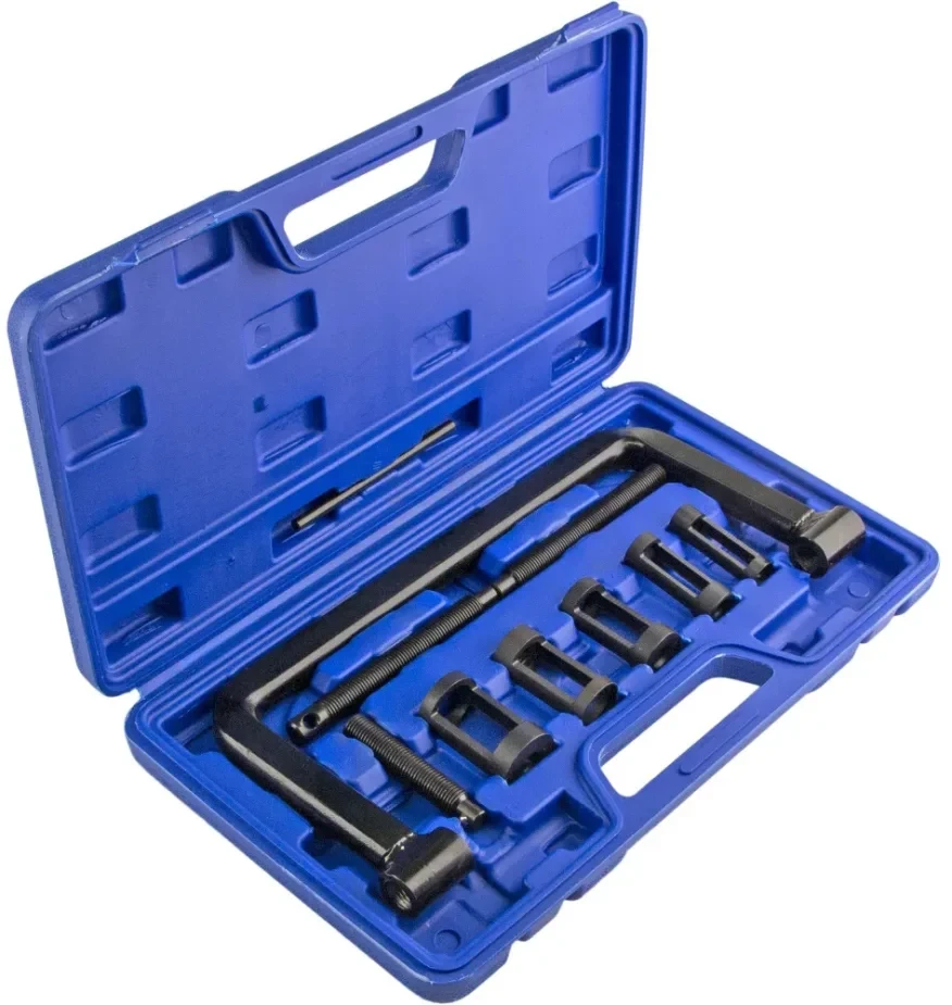 - С-образная струбцина позволяет создать постоянный соосный контакт, а адаптеры сжимают и фиксируют клапанную пружину.