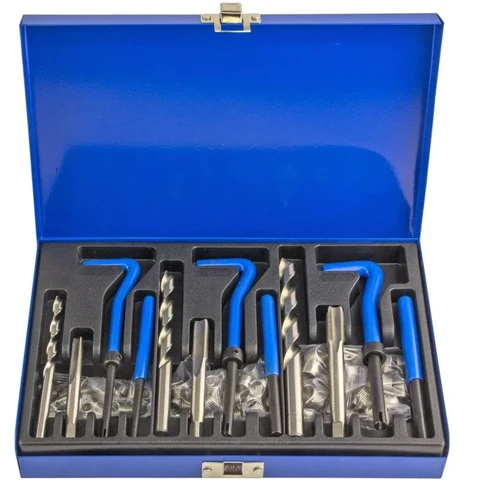 - Применение данного набора обеспечивает быстрое восстановление поврежденной резьбы при помощи специальных приспособлений.