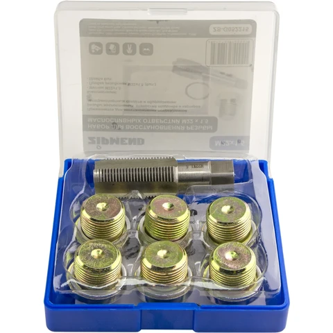 - Применение данного набора обеспечивает быстрое восстановление поврежденной резьбы при помощи специальных приспособлений.