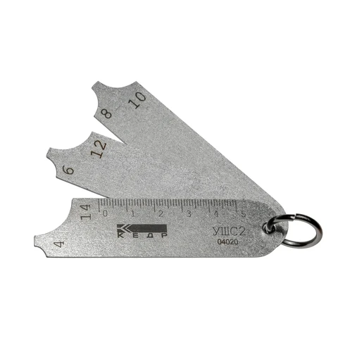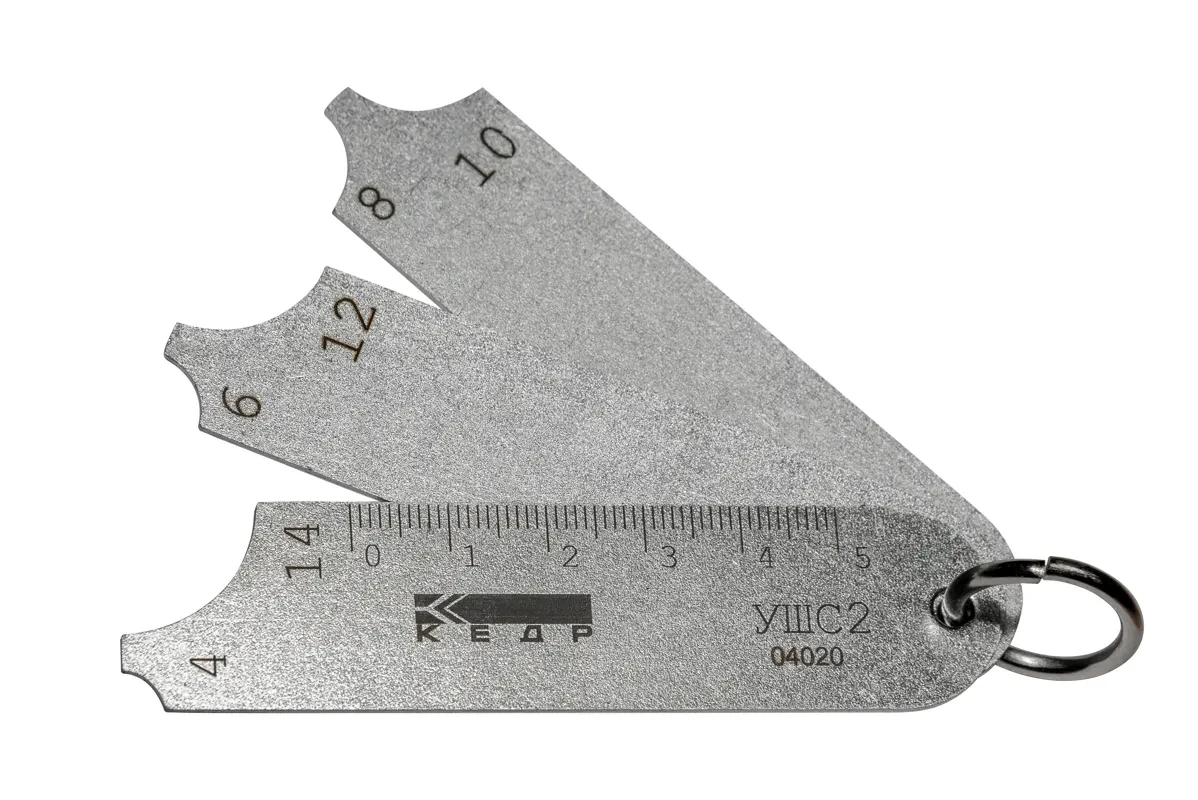 Шаблон сварщика УШС-2 (катетомер) используется для определения катетов угловых сварочных швов в диапазоне от 4 мм до 14 мм.