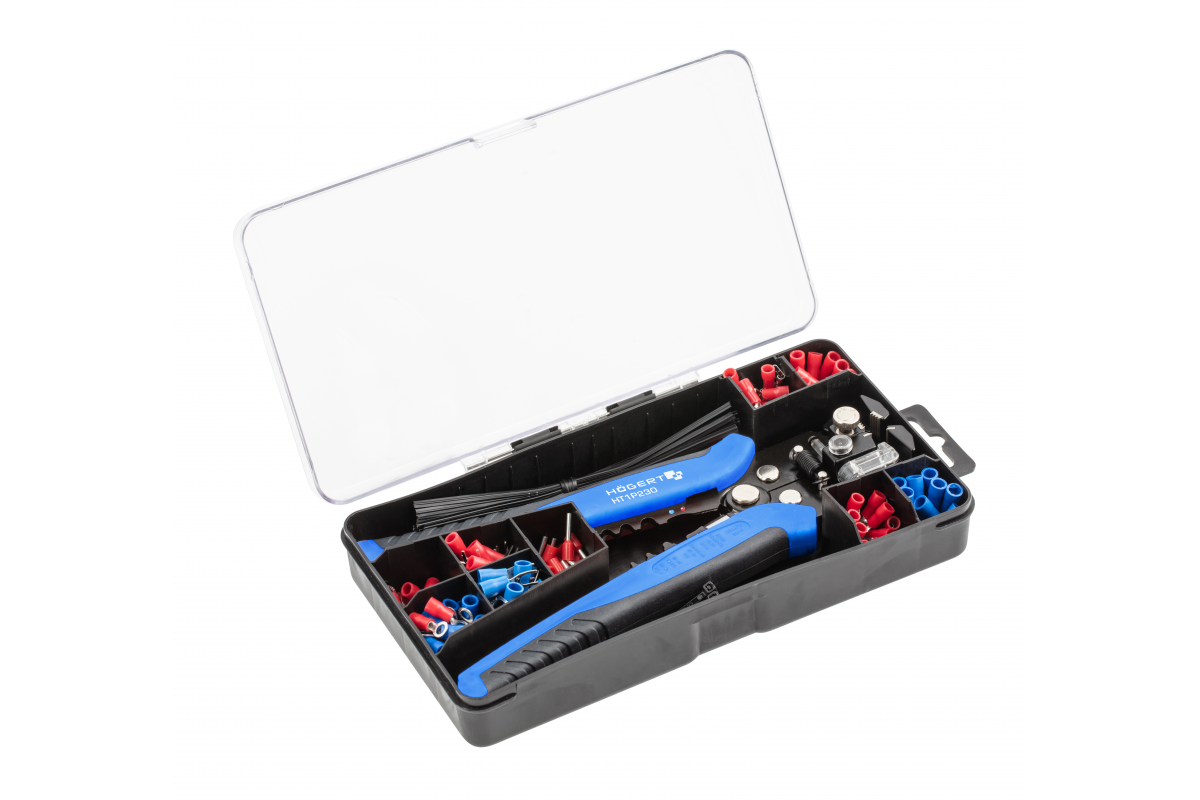 Автоматические клещи для зачистки проводов с набором из 200 коннекторов упакованы в практичную пластиковую упаковку. Применяются в электронике, электрике, телекоммуникациях и других монтажных работах.
