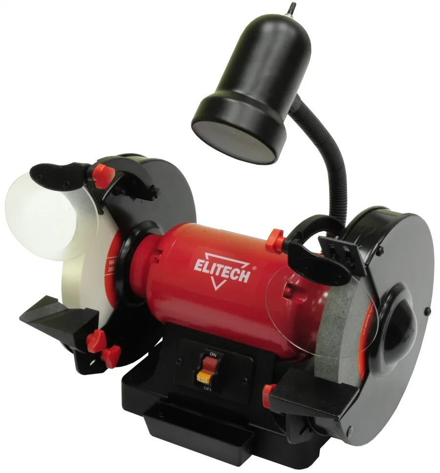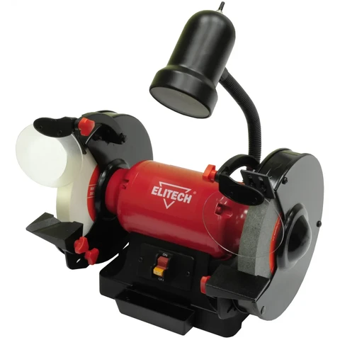 Электрическое точило Elitech СТ 600С мощностью 600 Вт предназначено для обработки шлифованием различных предметов, заточки дерево и металлообрабатывающего инструмента, шанцевого и садового инструмента. Посадка шлифовальных кругов осуществляется через металлические фланцы, что обеспечивает очень низкий уровень вибрации при работе. Диаметр круга 200 мм, толщина 20 мм, посадочный диаметр 32 мм. Перед кругами установлены регулируемые упоры для обрабатываемых предметов с пазами для заточки сверл. Открытая часть кругов имеет защиту в виде регулируемого прозрачного экрана, что позволяет защитить пользователя от искр и осколков при работе. Защитный экран имеет зону с увеличительным стеклом для улучшения видимости в зоне обработки. Этой же цели служит светодиодная лампа подсветки на гибкой опоре. В нижней части точила крепится комплектная емкость для охлаждающей жидкости. Включается точило выключателем с защитой от случайного пуска. В станине есть отверстия для фиксации точила к основанию.