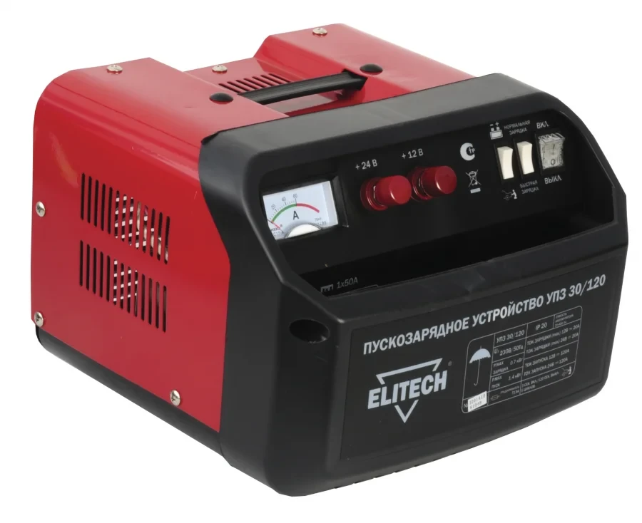 Пуско-зарядное устройство УПЗ 30/120 предназначено для зарядки автомобильных свинцово-кислотных батарей, напряжением 12 и 24 В, емкостью от 20 до 400Ач. А также для запуска двигателя автомобиля током запуска 120А при разрядившемся аккумуляторе.