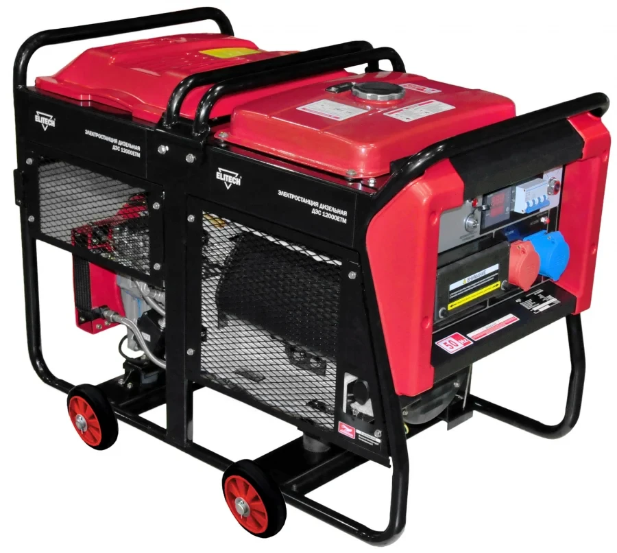 Электростанция ДЭС 12000ЕТМ с дизельным двигателем. Трехфазная. Номинальная мощность 10кВт. Одна розетка 220В/16А. Одна розетка 380В/32А. Силовые клеммы. Электростартер.