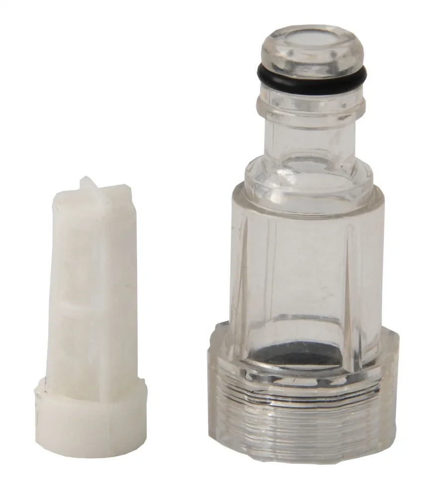 Предназначен для быстрого подключения шланга подачи воды к мойке. Содержит в себе фильтр тонкой очистки воды.(съемный). Материал корпуса и фильтрующего элемента пластик