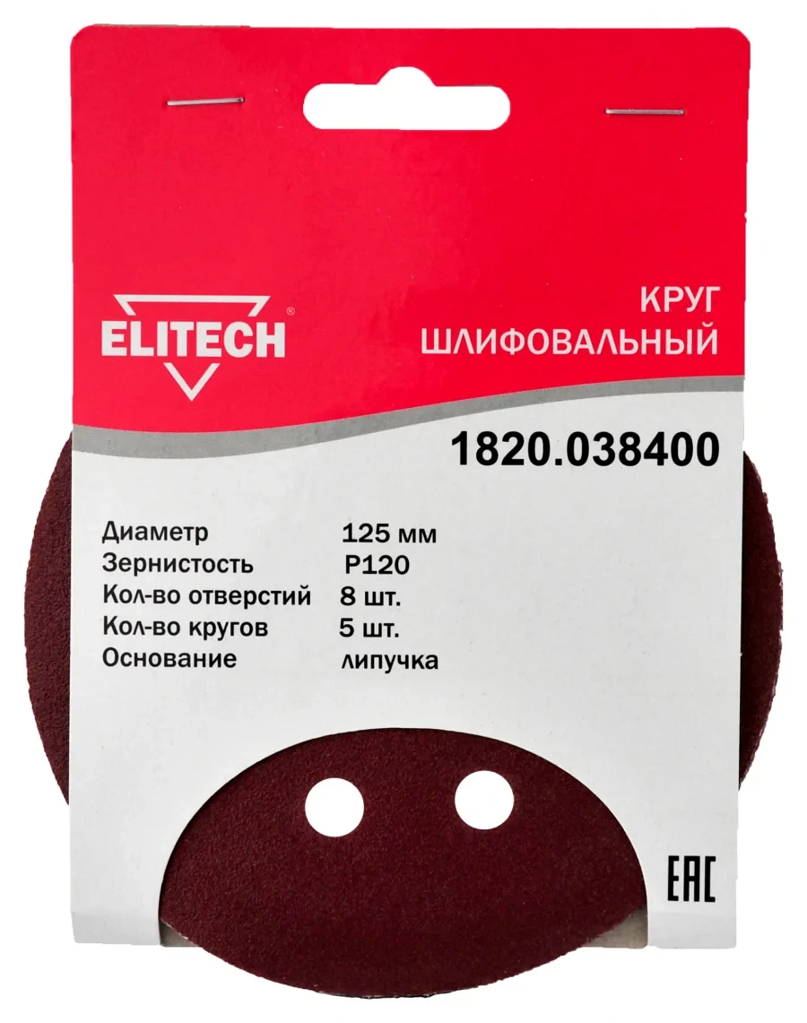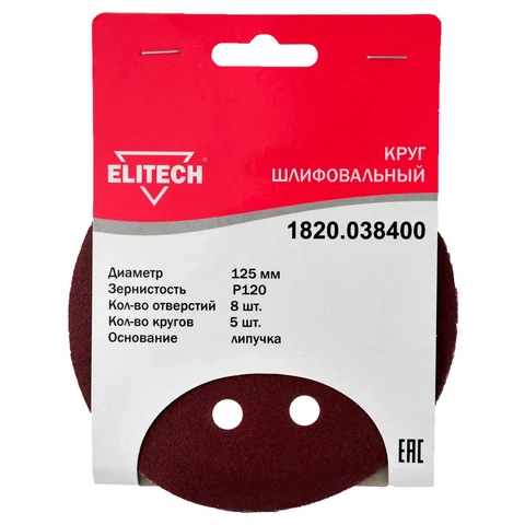 - Круг шлифовальный Ø125мм., зернистость Р120, 8 отверстий, 5шт., Elitech 1820.038400;