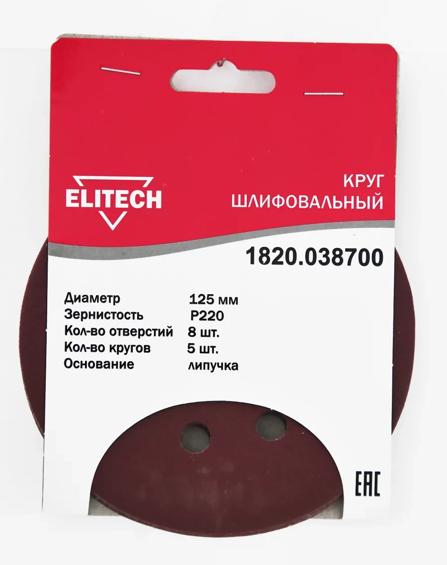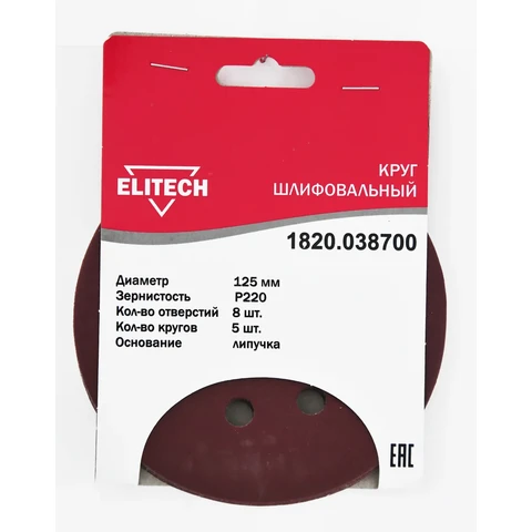 - Круг шлифовальный Ø125мм., зернистость Р220, 8 отверстий, 5шт., Elitech 1820.038700;
