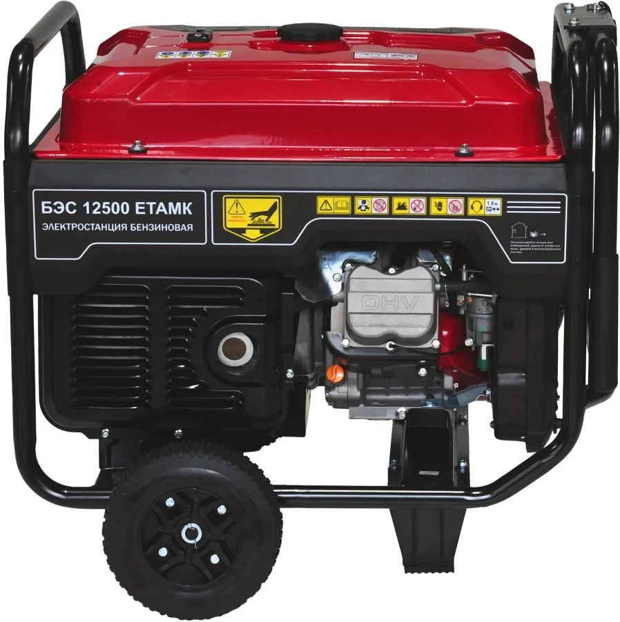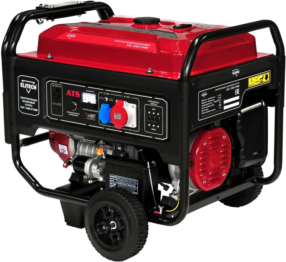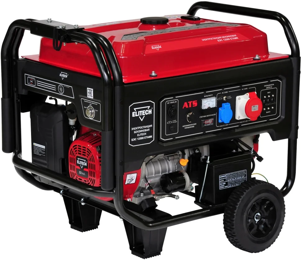 Электростанция бензиновая трехфазная БЭС 12500 ЕТАМК с четырехтактным бензиновым двигателем. Трехфазная. Номинальная мощность 9 кВт при 380В, 3 кВт при 220В. Одна розетка 220В/16А. Одна розетка 380В/32А. Электрический стартер. Работа с блоком автоматического ввода резерва АВР 20Т.