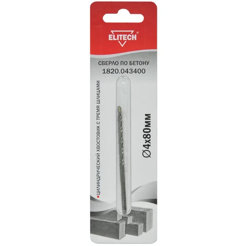 - Сверло 4х80мм., 3 шлица, бетон, Elitech 1820.043400;