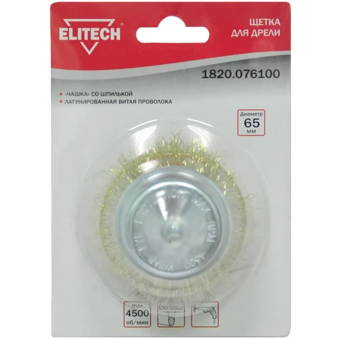 Щетка для дрели, 65 мм, 'чашка' со шпилькой, латунированная витая проволока 0,3 мм
