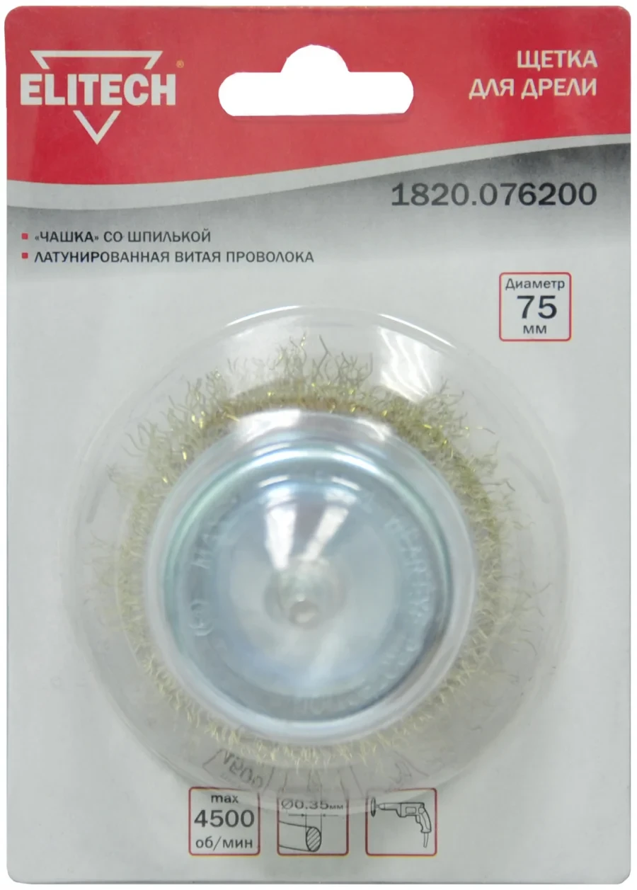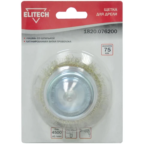 Щетка для дрели, 75 мм, 'чашка' со шпилькой, латунированная витая проволока 0,3 мм
