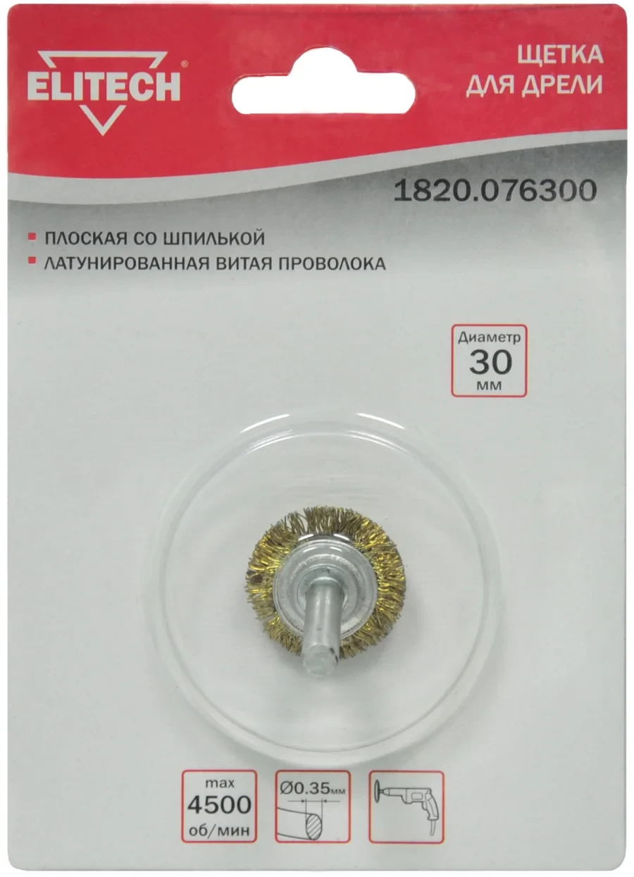Щетка д\\дрели, 30 мм, плоская со шпилькой, латунированная витая проволока 0,3 мм