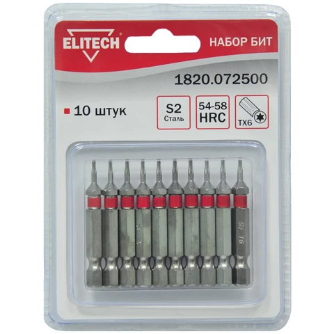 Набор бит- 10штСталь: S2 Твердость стали: HRC 54-58Тип: TORX6Длина биты: 50ммУпаковка блистер