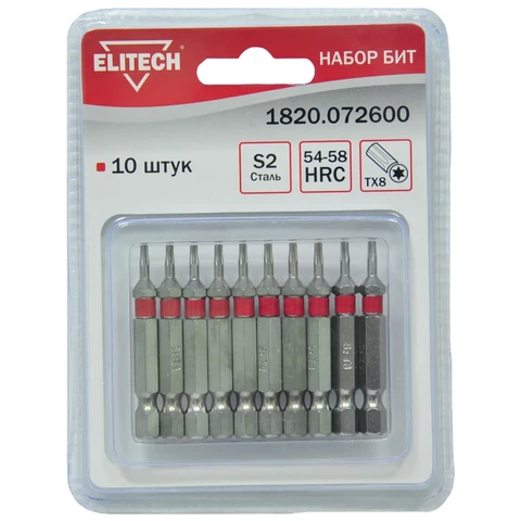 Набор бит- 10штСталь: S2 Твердость стали: HRC 54-58Тип: TORX8Длина биты: 50ммУпаковка блистер
