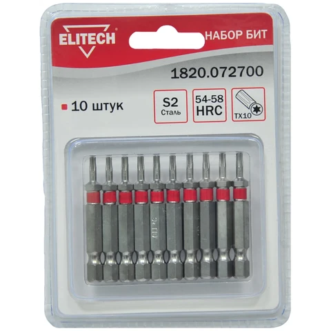 Набор бит- 10штСталь: S2 Твердость стали: HRC 54-58Тип: TORX10Длина биты: 50ммУпаковка блистер