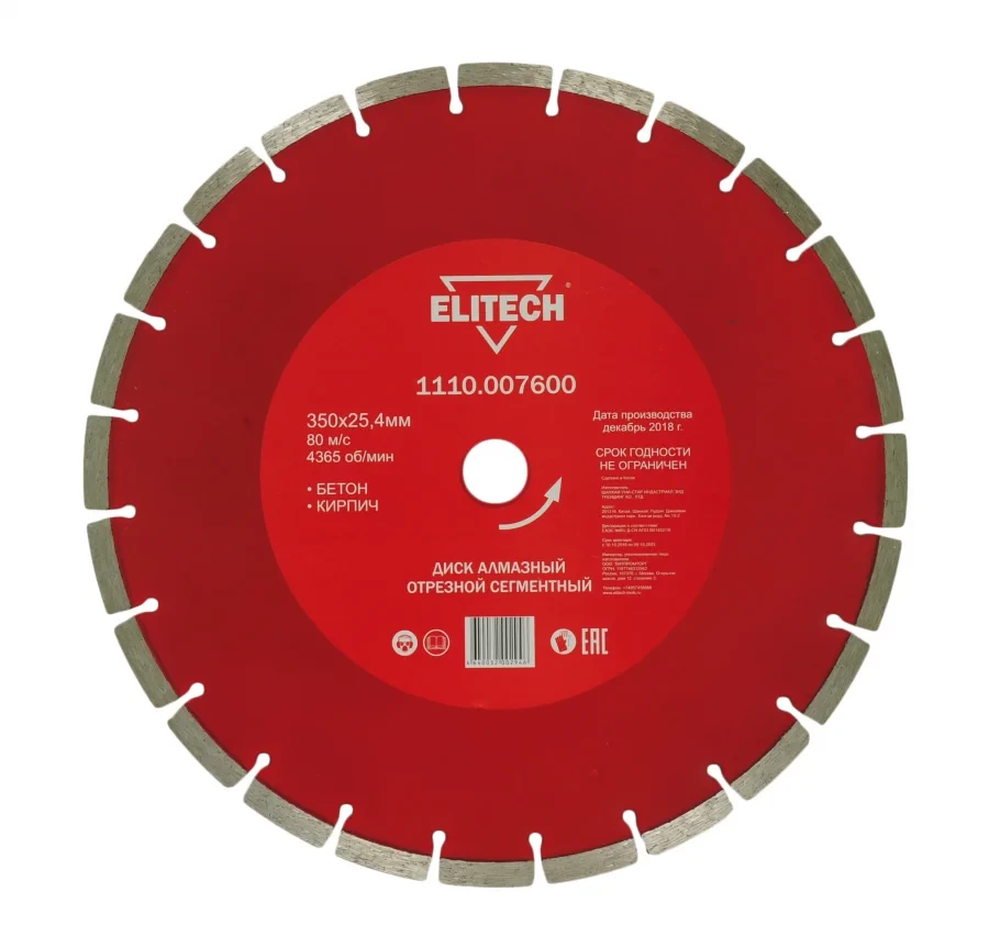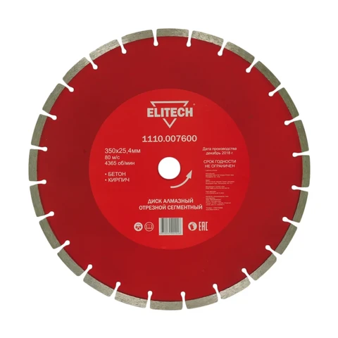- Диск алмазный сегментный Ø350х25,4 бетон Elitech 1110.007600 предназначен для камнерезных станков.