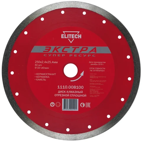 - Диск алмазный сплошной Экстра/супер ресурс, Ø250х25,4х2.4 мм., плитка Elitech 1110.008100 предназначен для камнерезных станков.