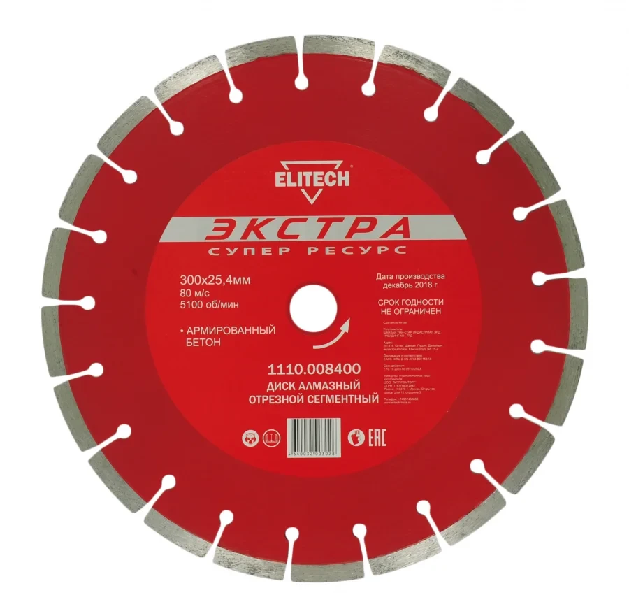 - Диск алмазный сегментный Экстра/супер ресурс, 300х25,4 бетон армированный Elitech 1110.008400 предназначен для камнерезных станков.
