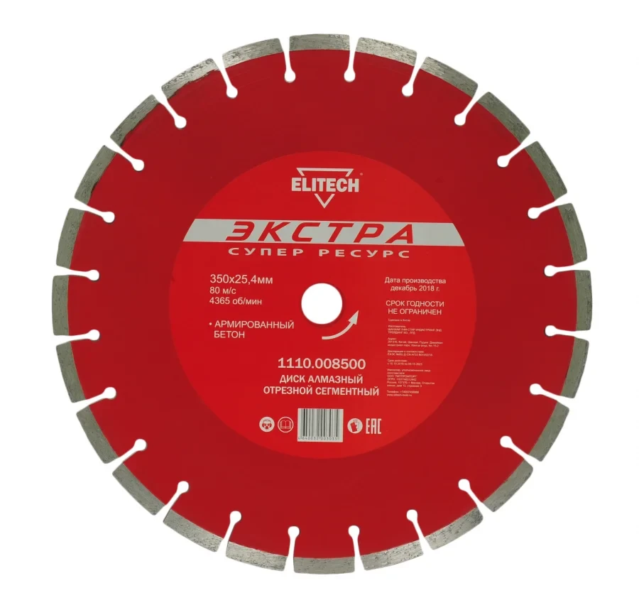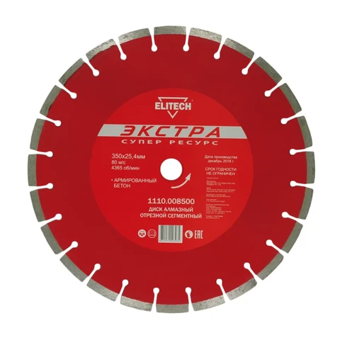 - Диск алмазный сегментный Экстра/супер ресурс, 350х25,4 бетон армированный Elitech 1110.008500 предназначен для камнерезных станков.