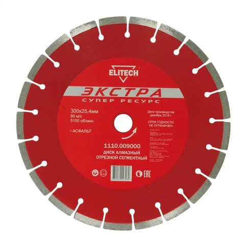 - Диск алмазный сегментный Экстра/супер ресурс, 300х25,4 асфальт Elitech 1110.009000 предназначен для камнерезных станков.