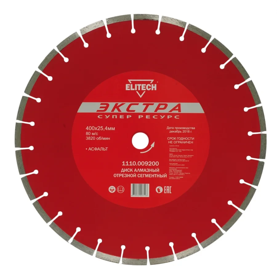 - Диск алмазный сегментный Экстра/супер ресурс, 400х25,4 асфальт Elitech 1110.009200 предназначен для камнерезных станков.