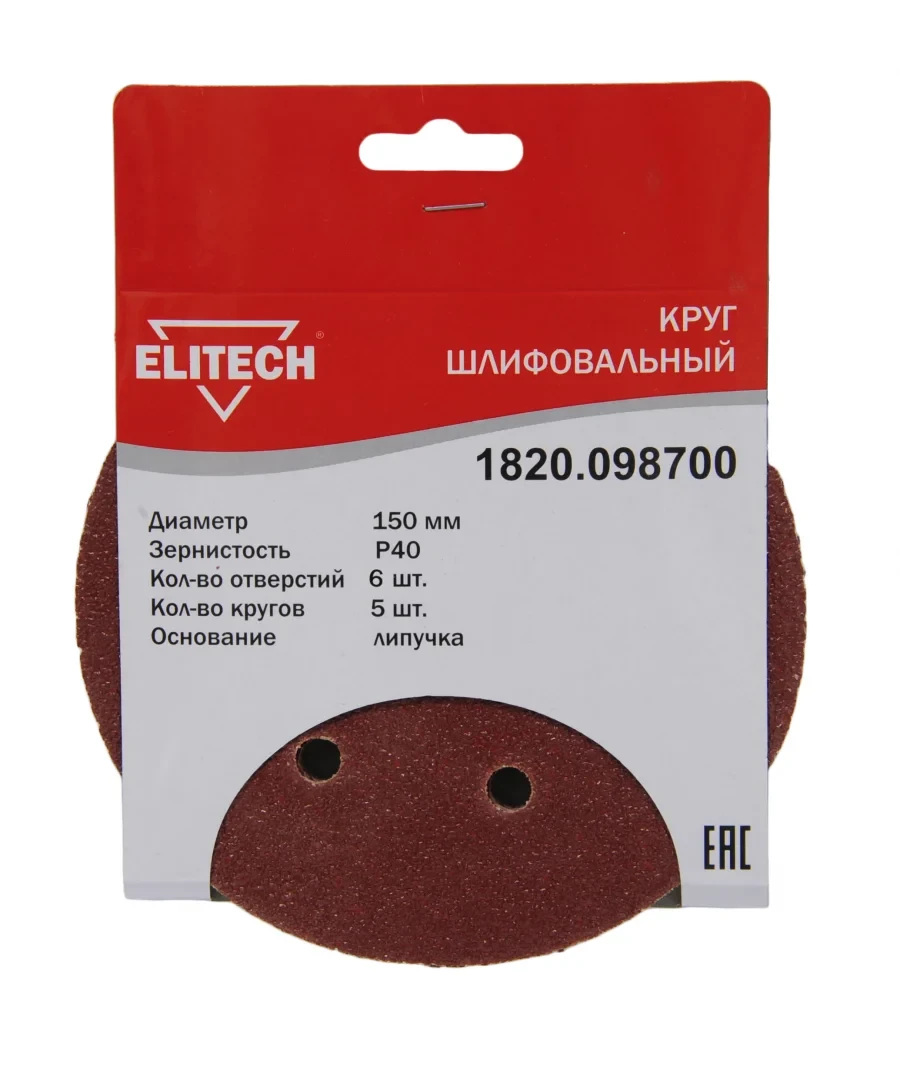 - Круг шлифовальный Ø150мм., зернистость Р40, 6 отверстий, 5шт., Elitech 1820.098700;