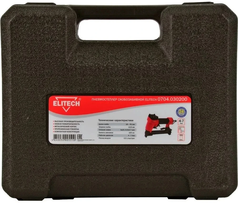 Пневмостеплер скобозабивной 0704.030200 для работы использует сжатый воздух от компрессора давлением от 4 до 7 бар. Степлер используется для креплени гипсокартона, утеплителя, фанеры и прочего. В качестве оснастки применяются скобы размером 6-16 мм. Вместимость магазина составляет 100 штук. Скобы - тип 80.