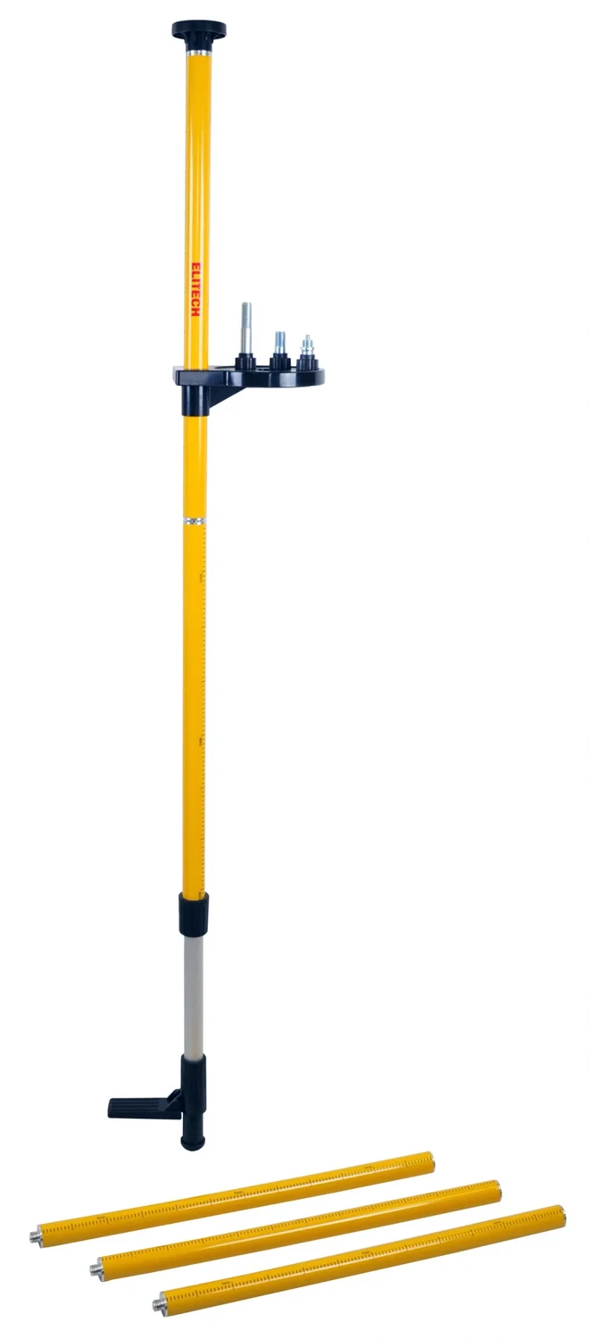 Распорная рейка для установки лазерных нивелиров. Рейка распирается между полом и потолком. Количество секций 6, можно регулировать высоту добавляя или убирая секции. Верхние две секции неразъемные телескопические и позволяют произвести установку рейки под любую высоту потолка в пределах 3,6 метров. Дополнительный штатив-тринога в комплект к данной рейке не входит.