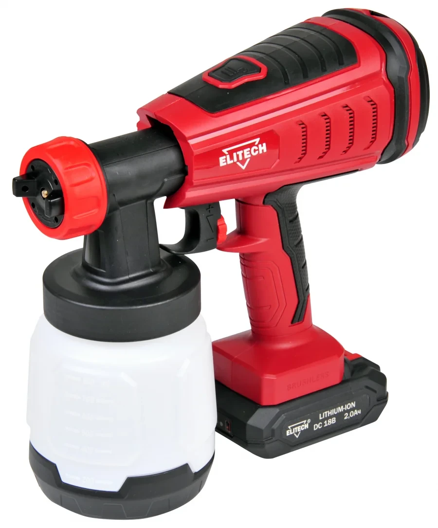Преимущества BL мотор, высокий ресурс двигателя, регулировка интенсивности подачи краски, равномерное распыление, система распыления HVLP, вместительный бачок, эргономичная нескользящая рукоятка, компактная конструкция, работает от универсальных Li-Ion аккумуляторов Elitech.