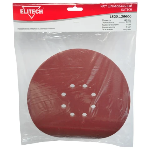Круг шлифовальный 225 мм, з. Р220, 5 шт., липучка, 8 отверстий