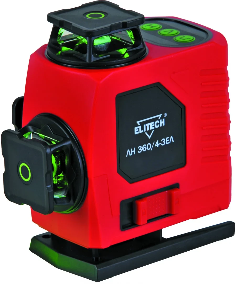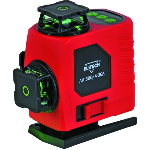 Модель ELITECH ЛН 360/4-ЗЕЛ (Е0306.018.00) с автоматическим самовыравниванием проецирует 4 круговых линии с охватом 360 градусов - две горизонтальных и две взаимно перпендикулярных вертикальных. Пересечения линий образуют 10 точек - над прибором (зенит), под прибором (надир) и по 4 точки в плоскости горизонтальных линий с углами 90 градусов между собой. Линии можно включить раздельно или одновременно. Есть возможность отключить самовыравнивание для проецирования наклонных линий. Зеленый цвет луча лучше видно в условиях яркой освещенности, яркость линий можно регулировать. Дальность работы до 25 метров. Нивелир имеет отверстие для установки на штатив, с резьбой 1/4 дюйма. В качестве элемента питания используется Li-Ion аккумулятор.