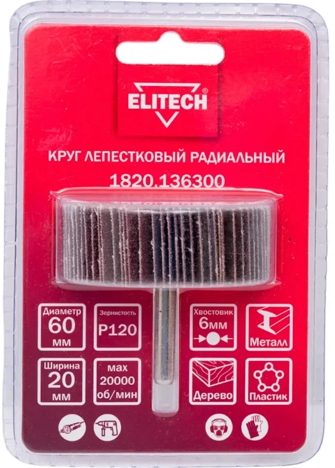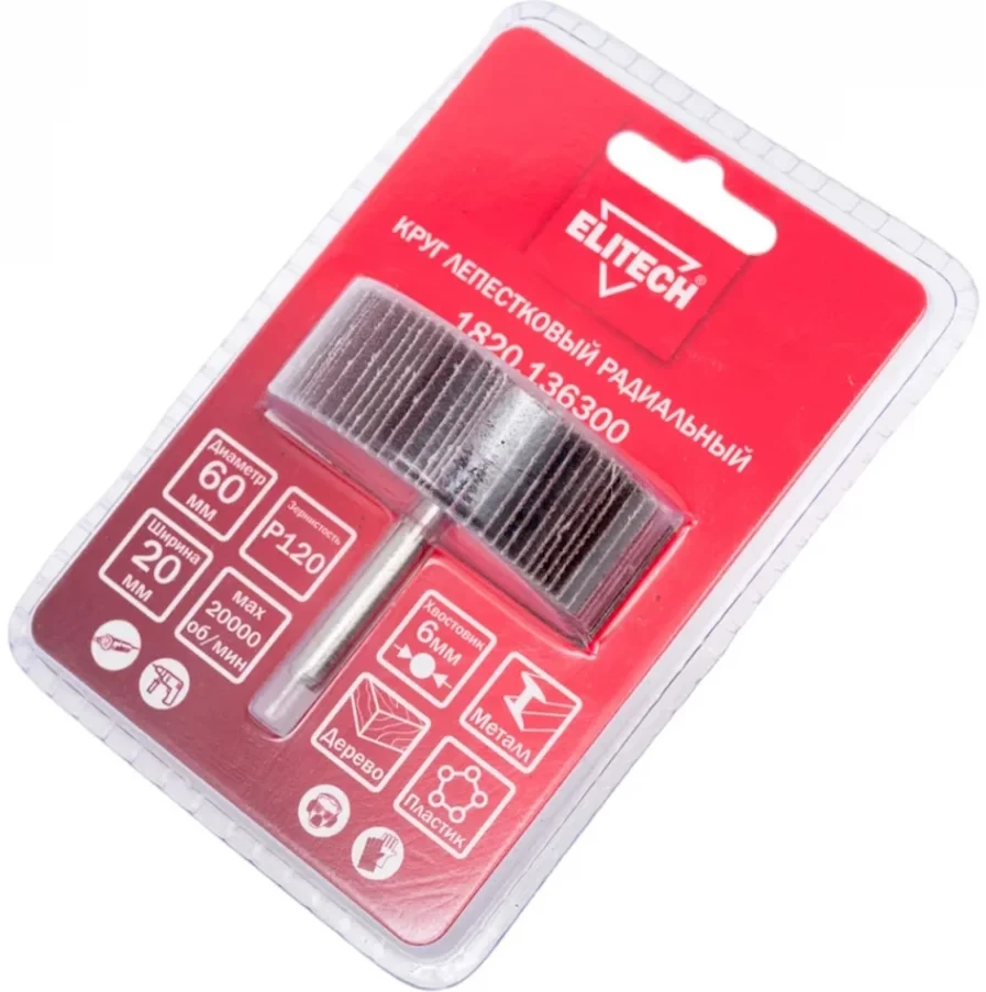 - Круг лепестковый 60х20х6 мм., P120, Elitech 1820.136300;