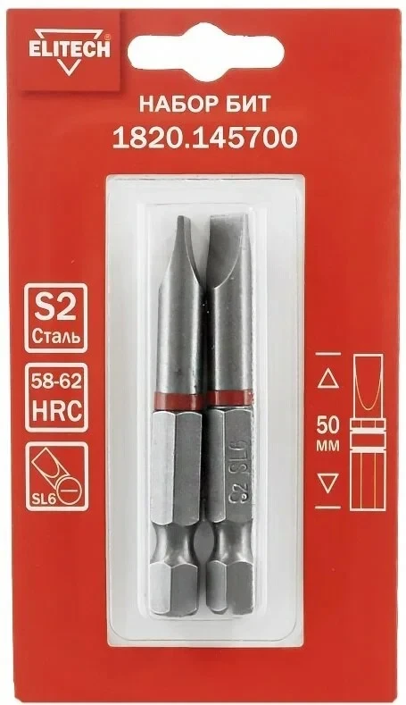 - Биты SL6 50мм 2шт Elitech 1820.145700 - 2 шт.;