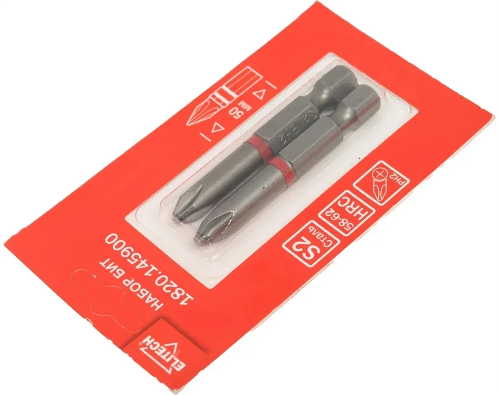 - Набор включает в себя 2 предмета: биты с профилем PH(2), длиной 50мм., хвостовик HEX 1/4"DR(тип E).