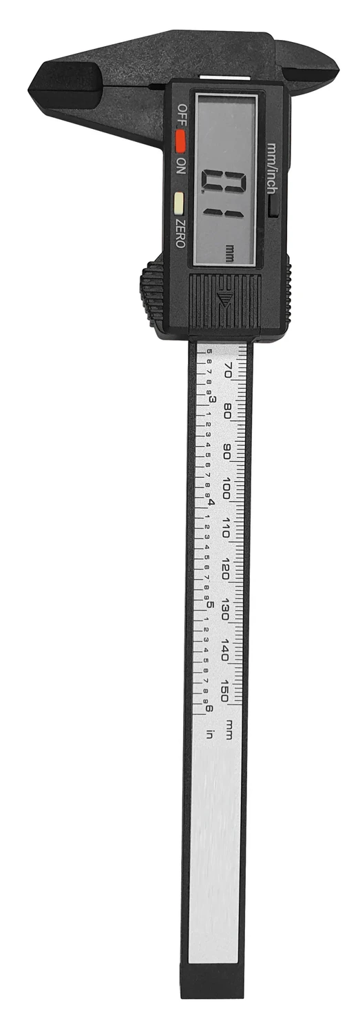 Штангенциркуль цифровой с дисплеем. Пластиковые губки. Выбор единицы измерения (дюймы или миллиметры). Измеряет внутренние и наружные диаметры, глубину отверстий. Питание от одного элемента питания LR44.