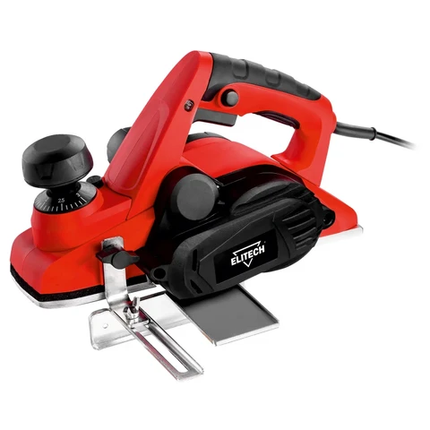Патрубок для подключения пылесоса обеспечивает сбор стружки в пылесос или выброс в сторону. Плавная регулировка глубины строгания осуществляется путем поворота опорной ручки. Кнопка блокировки случайного включения делает работу оператора безопасной.
