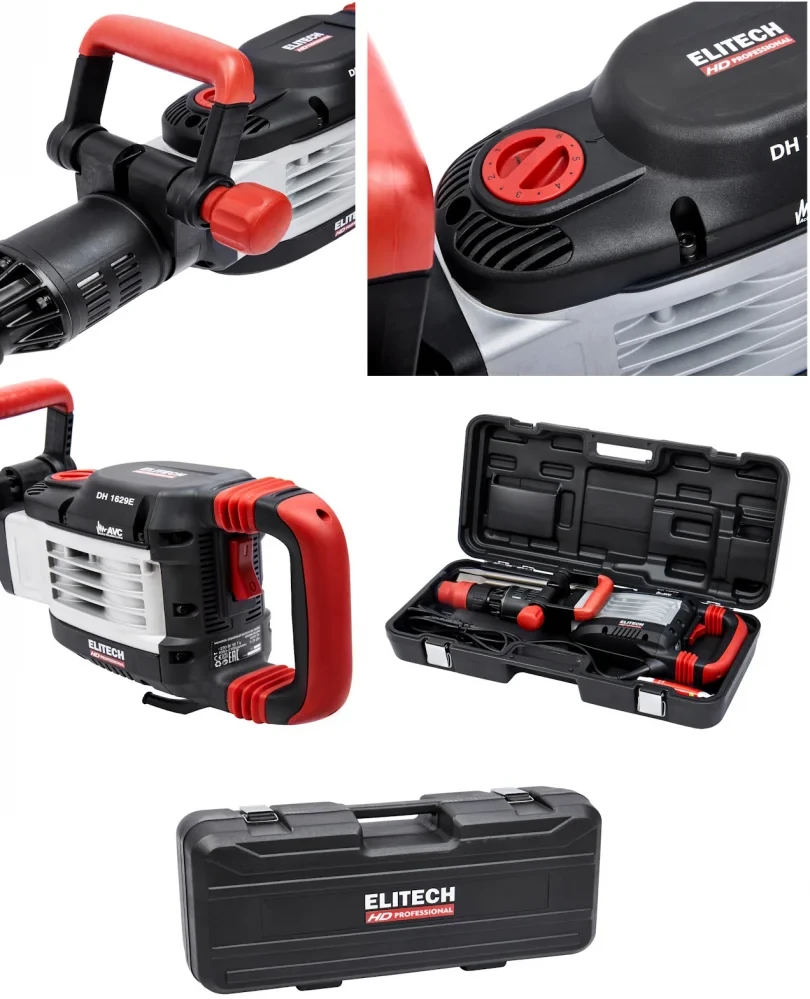 - Электрический отбойный молоток ELITECH HD DH 1629E (E2205.023.01) артикул 204004 мощностью 1650 Вт и энергией удара 5-29 Дж предназначен для дробления и раскалывания твердых материалов (бетон, дорожные покрытия, кирпич, штукатурка, природный и искусственный камень), штробления пазов и каналов, проделывания проемов в стенах из кирпича и бетона и других строительно-монтажных работ с использованием соответствующей оснастки.