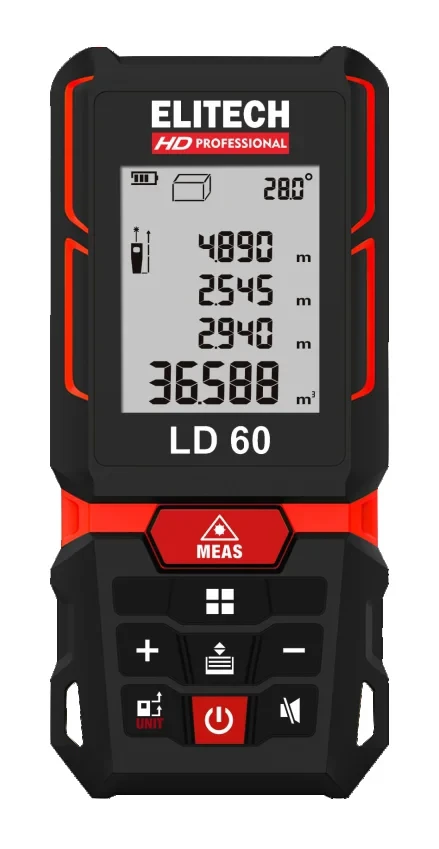 Дальномер ELITECH HD LD 60 предназначен для быстрого измерения расстояния с высокой точностью. Имеет дополнительные функции для измерения площади, объема, угла наклона и высоты с помощью режимов косвенного измерения.