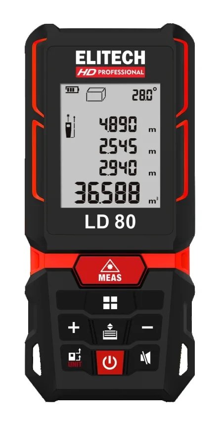 Дальномер ELITECH HD LD 80 предназначен для быстрого измерения расстояния с высокой точностью. Имеет дополнительные функции для измерения площади, объема, угла наклона и высоты с помощью режимов косвенного измерения.
