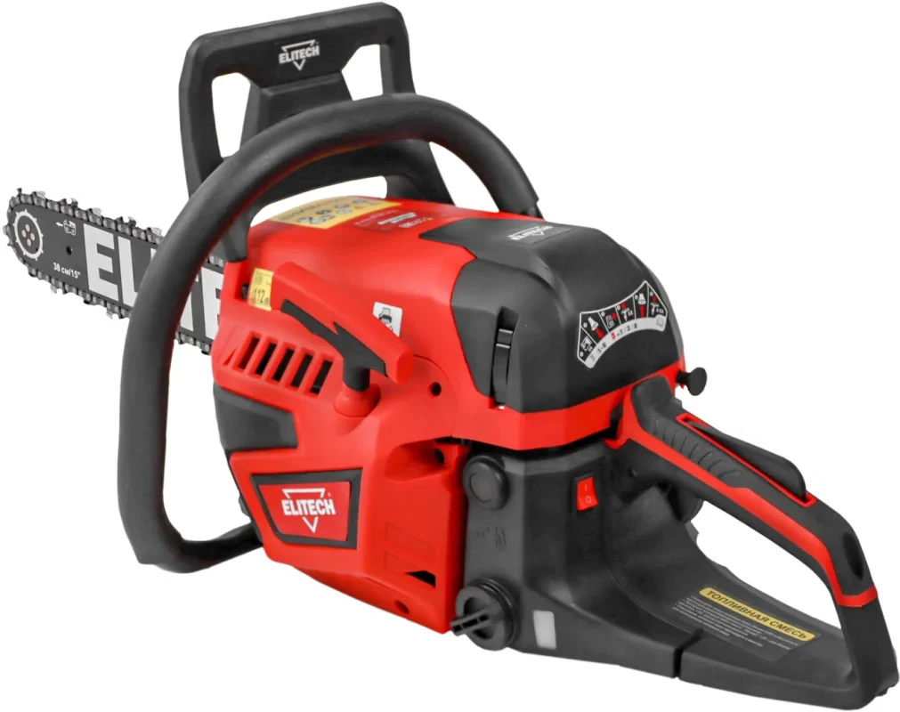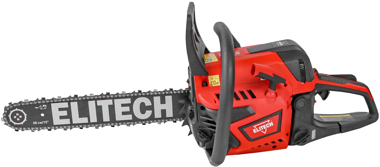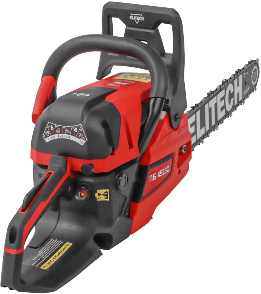 - Бензиновая цепная пила Elitech ПБ 4523С мощностью 2,3 л.с. и с шиной длиной 38 см, предназначена для валки деревьев, обрезки веток и сучьев, раскряжевки и заготовки дров.
