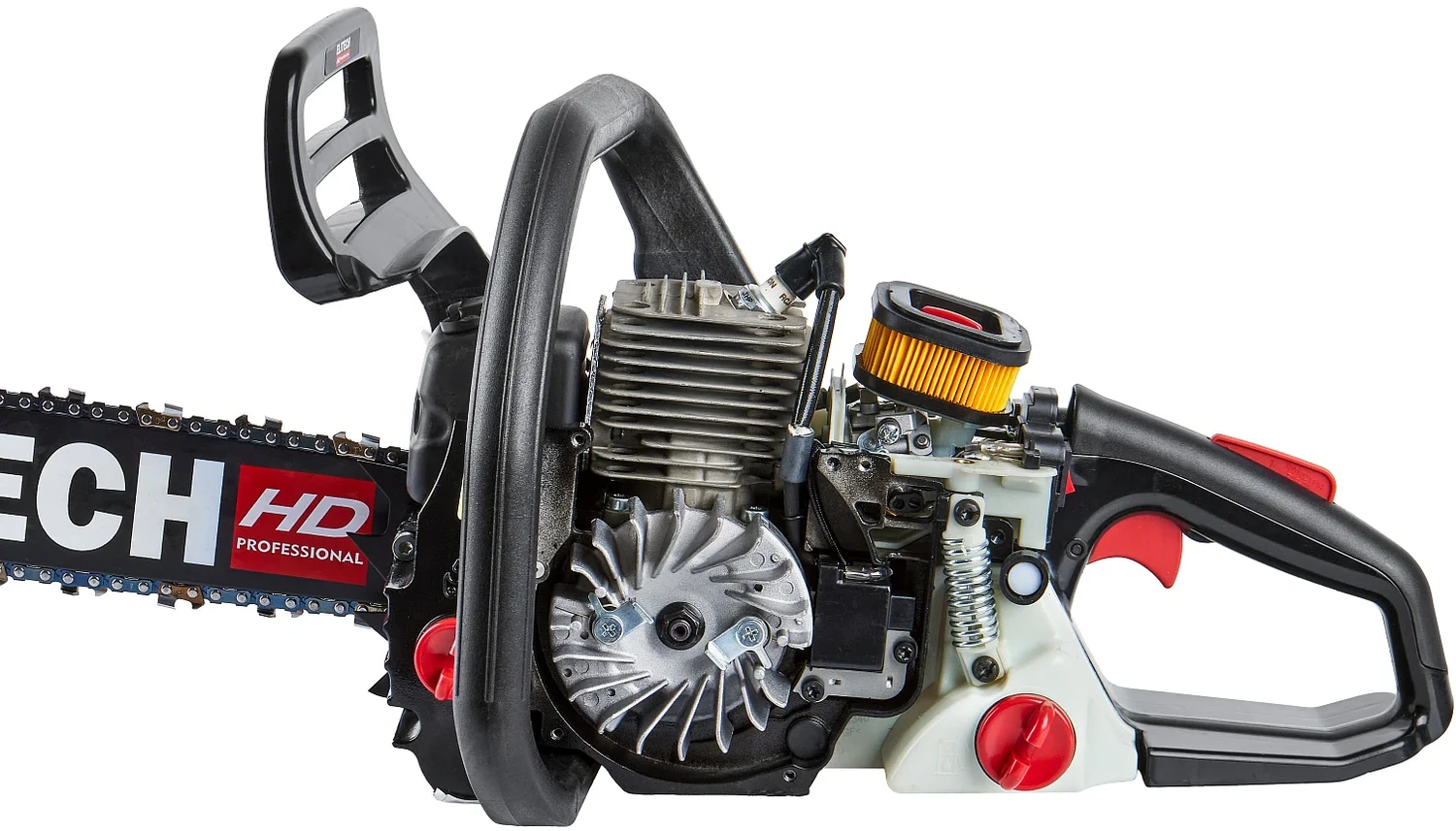 - Цепная пила оснащена двухтактным двигателем внутреннего сгорания, работающим на смеси бензина и 2-тактного масла, приводящим в движение пильную цепь, двигающуюся по направляющей шине.