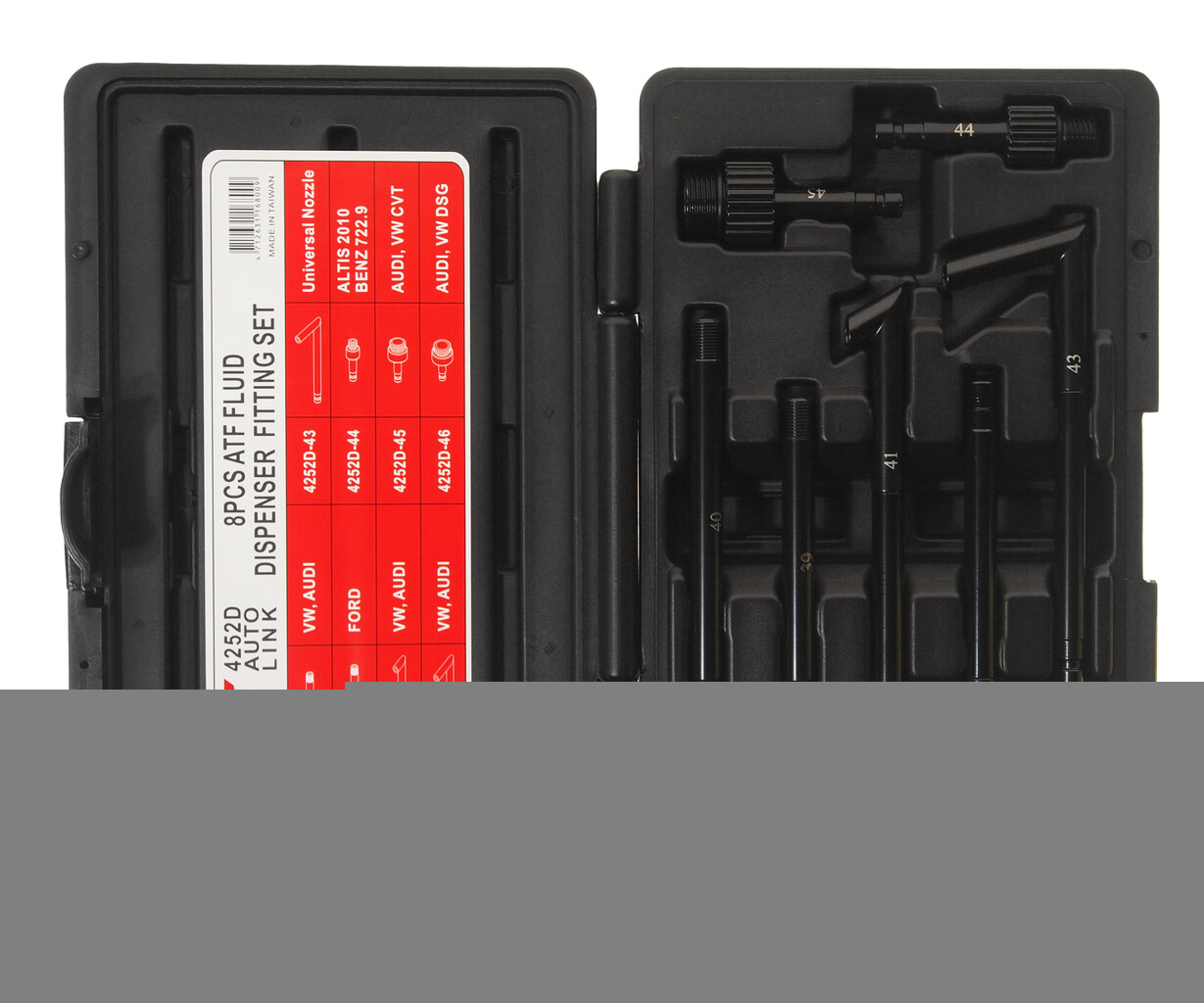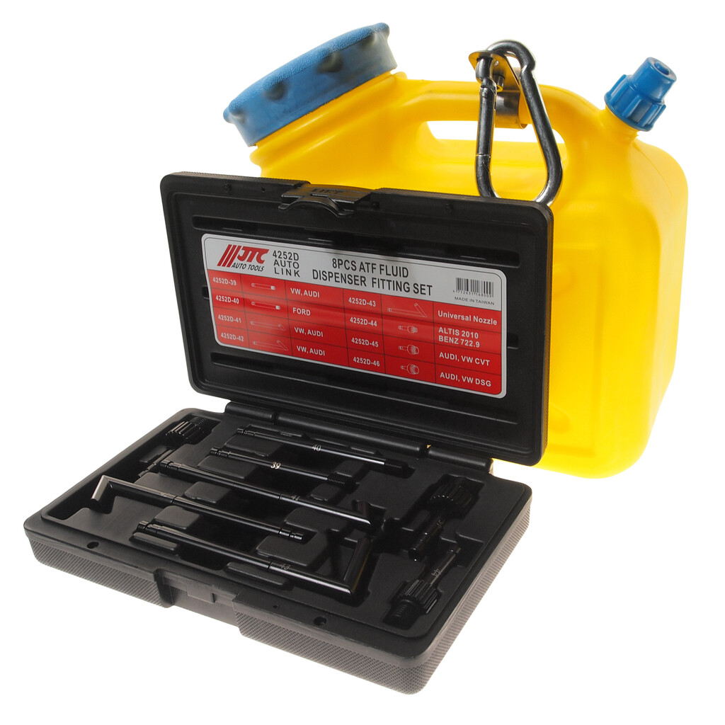 • Для заправки: заполните емкость маслом, подвесьте выше уровня АКПП, подсоедините шланг к АКПП. В процессе заправки можно доливать масло в емкость. Объем: 4 л. Поставляется с набором адаптеров (8 шт.) аналогичным из JTC-4252.