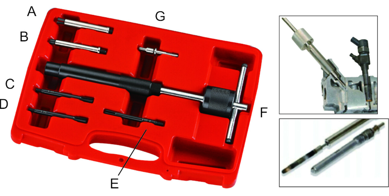 • Комплектация (A) Съемник цанговый. Размер: 6.0 мм. (внутренний Ø - 7.7 мм.) (B) Съемник цанговый. Размер: 5.0 мм. (внутренний Ø - 6.8 мм.) (C) Съемник цанговый: Размер: 5.0 мм. (D) Съемник цанговый: Размер: 3.6 мм. (E) Съемник цанговый: Размер: 2.7 мм. (F) T-образный держатель. (G) Съемник цанговый внутренний. Описание Набор предназначен для извлечения закоксованных и сломанных свечей накаливания. В комплект входит съемник для демонтажа поврежденных свечей. Порядок работы Снимите электрический разъем свечи накаливания. Открутите свечу накаливания. Выберите подходящий цанговый съемник. Вкрутите его в Т-образный держатель. Установите держатель со съемником на свечу накаливания. Начинайте прокручивать рукоятку Т-образного держателя по часовой стрелке. Для дальнейшего извлечения свечи начинайте работать обратным молотком. Свеча начнет извлекаться. Извлечение сломанных свечей накаливания: Просверлите в оставшейся части свечи накаливания по центру отверстие. Вкрутите внутренний цанговый съемник (G) в Т-образный держатель. Установите держатель со съемником в свечу накаливания. Начинайте прокручивать рукоятку Т-образного держателя по часовой стрелке. Для дальнейшего извлечения свечи начинайте работать обратным молотком. Свеча начнет извлекаться.