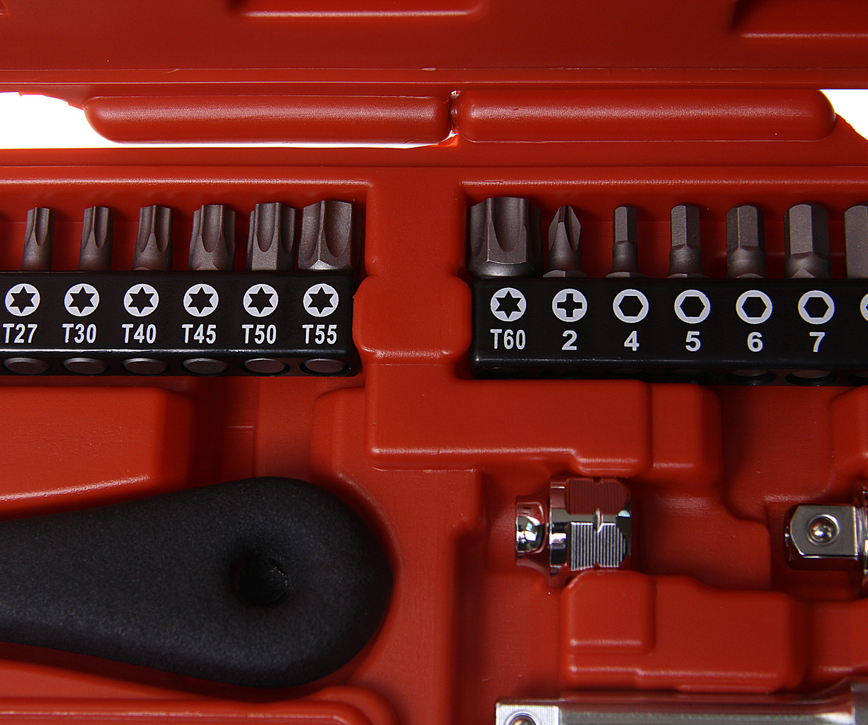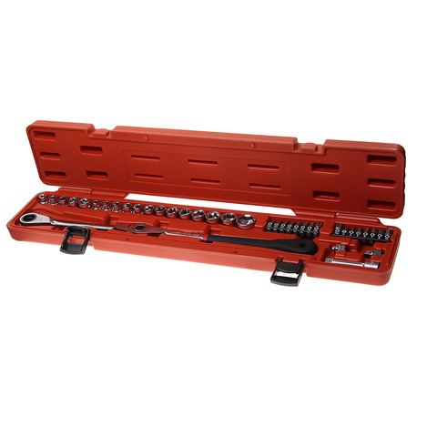 • Для использования на большинстве типов болтов натяжного шкифа ремня, может использоваться в ограниченном пространстве. В комплекте: Трещотка 100 зуб., длина 500 мм, регулируется на 180°) — 1 шт.. Мини-головки (длина 24 мм, диаметр 3/8" х 17 мм) — 18 шт.: Е10, Е12, Е14, Е16, Е18, 8, 9, 10, 11, 12, 13, 14, 15, 16, 17, 18, 19, 24 мм. Биты (5/16 "х 30 мм) — 16 шт.: Т20, Т25, Т27, Т30, Т40, Т45, Т50, Т55, Т60, Н4, Н5, Н6, Н7, Н8, Н10, РН2. Торцевая головка (3/8" х 17 мм) — 1 шт. Держатель для бит (5/16"х 17 мм) — 1 шт. Удлинитель (3/8" х 75 мм) — 1 шт.