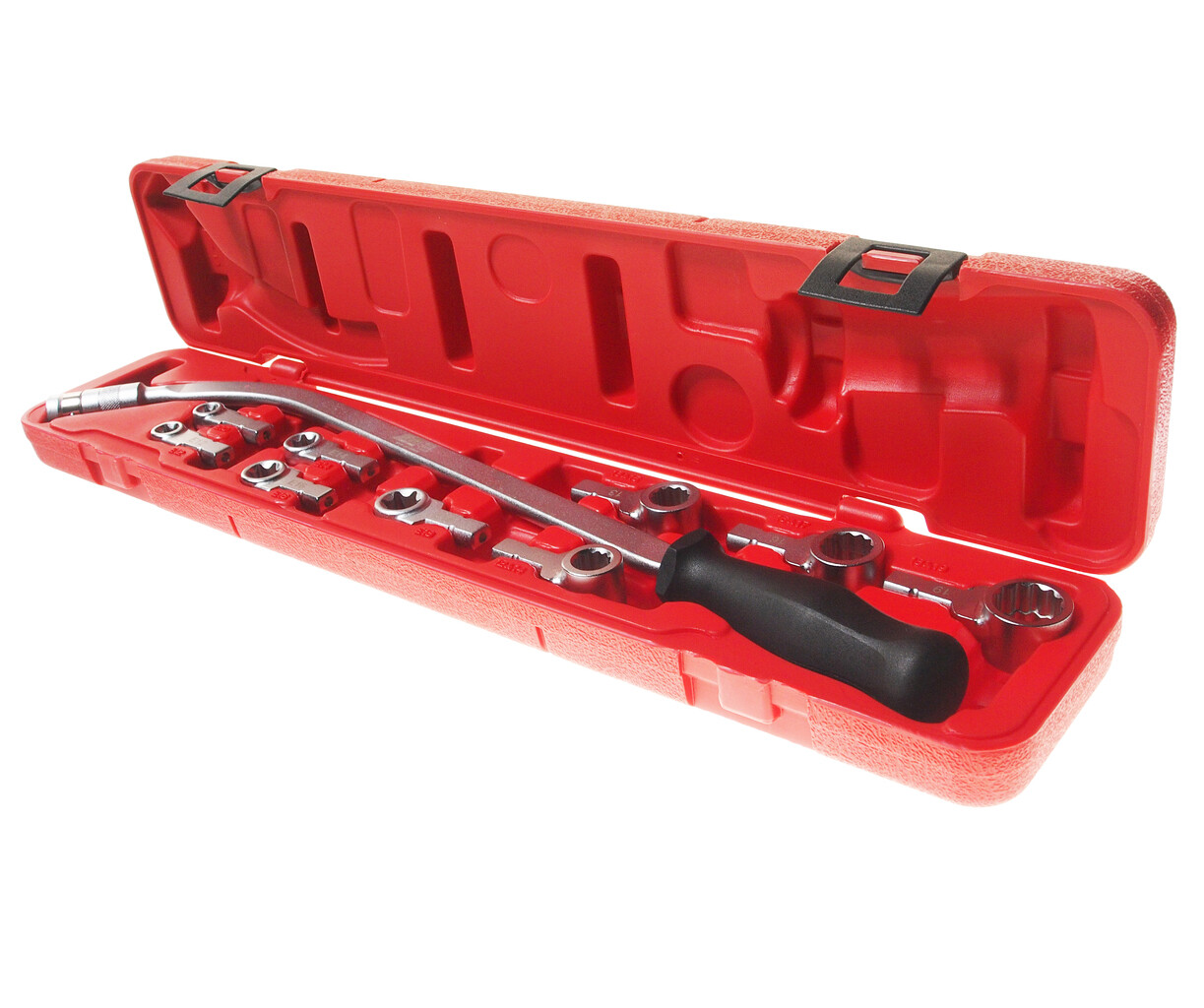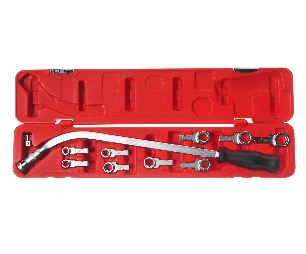 • Набор универсален в применении благодаря 13 адаптерам, входящим в комплект. Специально разработан для использования в ограниченном пространстве. Адаптеры: двусторонние 12, 13, 14, 15, 16, 17, 18, 19 мм; односторонние Е10, Е12, Е14, Е16, Е18.