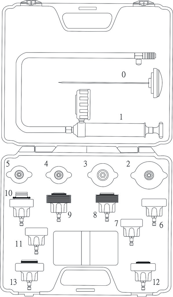 • Комплектация Термометр. Ручной насос. Поверочная крышка №2. Применение: GM (Cadillac). Поверочная крышка №3. Применение: Mercedes-Benz, GM (Buick), Jeep. Поверочная крышка №4. Применение: Peugeot, Subaru, Chrysler, Acura, GM, Mitsubishi, Nissan, Mazda, Toyota, Infiniti, Suzuki, Isuzu, Ford. Поверочная крышка №5. Применение: Honda, Toyota, Suzuki, Mitsubishi, Chrysler, Acura. Поверочная крышка №6. Применение: Mercedes-Benz (ML-class), GM. Поверочная крышка №7. Применение: Volvo, Saab, Citroen, Renault, Fiat, Alfa, Jeep. Поверочная крышка №8. Применение: VW (Vento T4, Passat-1996, Golf, Beetle, Sharan) Поверочная крышка №9. Применение: Audi (A4, A5, A6), BMW345, VW (Passat 1997-2002), Porsche (Cayenne). Поверочная крышка №10. Применение: BMW. Поверочная крышка №11. Применение: Audi, VW. Поверочная крышка №12. Применение: Ford, Land Rover, Opel, Jaguar, Mercedes-Benz. Поверочная крышка №13. Применение: Mercedes-Benz (C-class, E-class, S-class). Описание Набор предназначен для тестирования охладительной системы на предмет утечек. В комплект входит ручной насос и поверочные крышки.