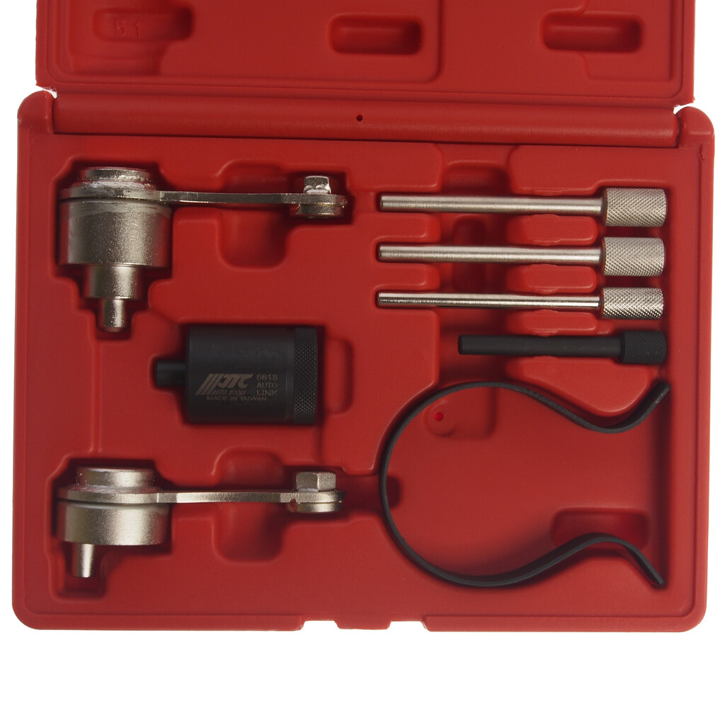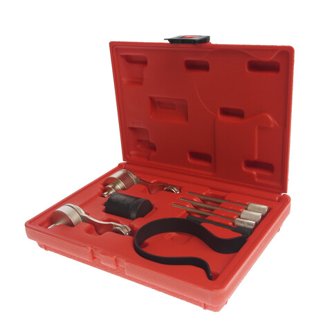 Набор состоит из блокировочных и контрольных штифтов, инструменты для блокировки маховика, штифт насоса охлаждающей жидкости и зажим для фиксации ремня.