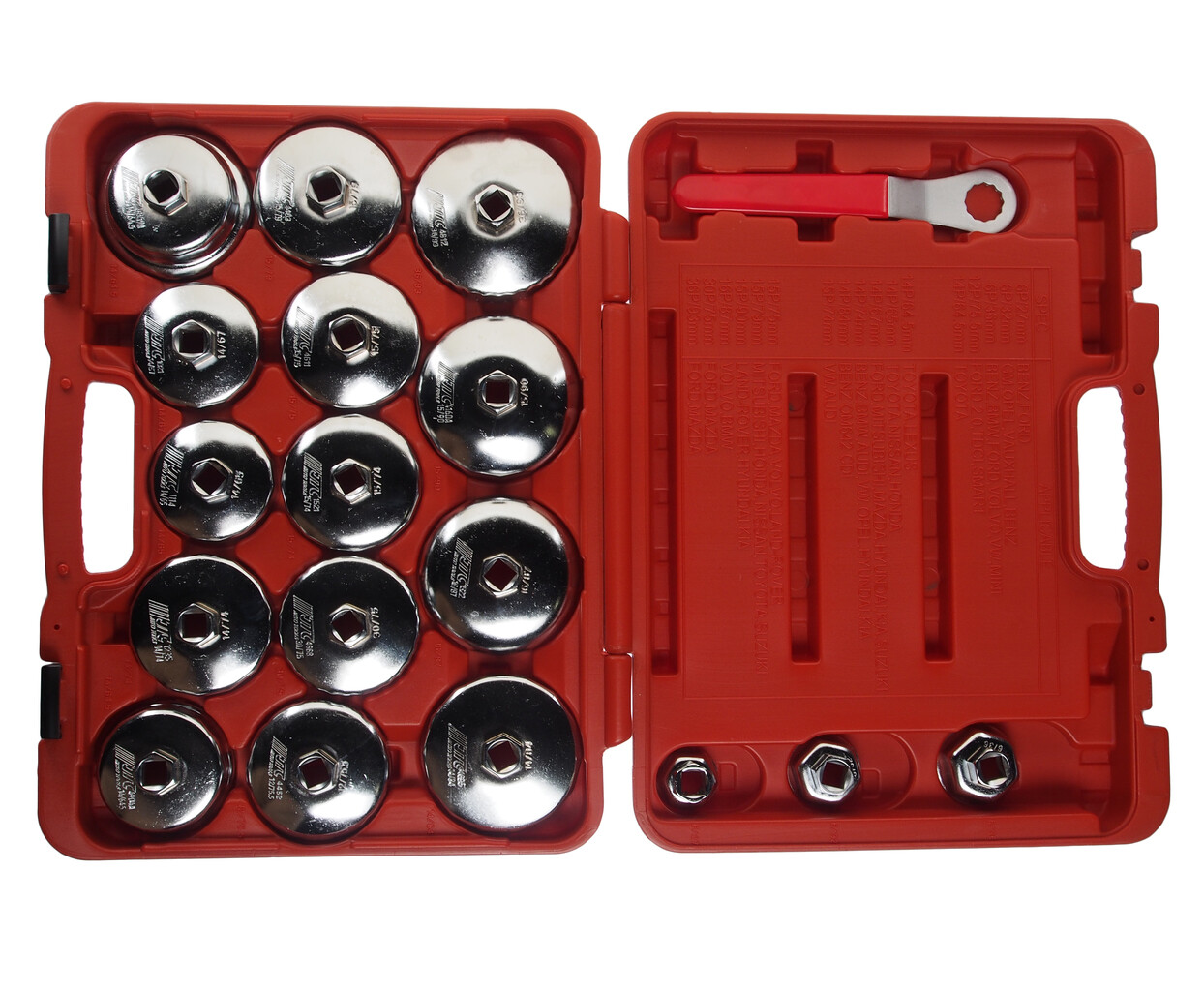 • Применяется с инструментом под квадрат 1/2" или ключом 21 мм. Съемники изготовлены из стали. В комплекте: 17 головок масляного фильтра: JTC-1114, 1021, 1235, 4695, 1521, 4611, 1403, 4160А, 1522, 4452, 4668, 4612, 4904А, 4859А, 4571, 4352, 4353. 1 ключ накидной: 21 мм/12 граней.